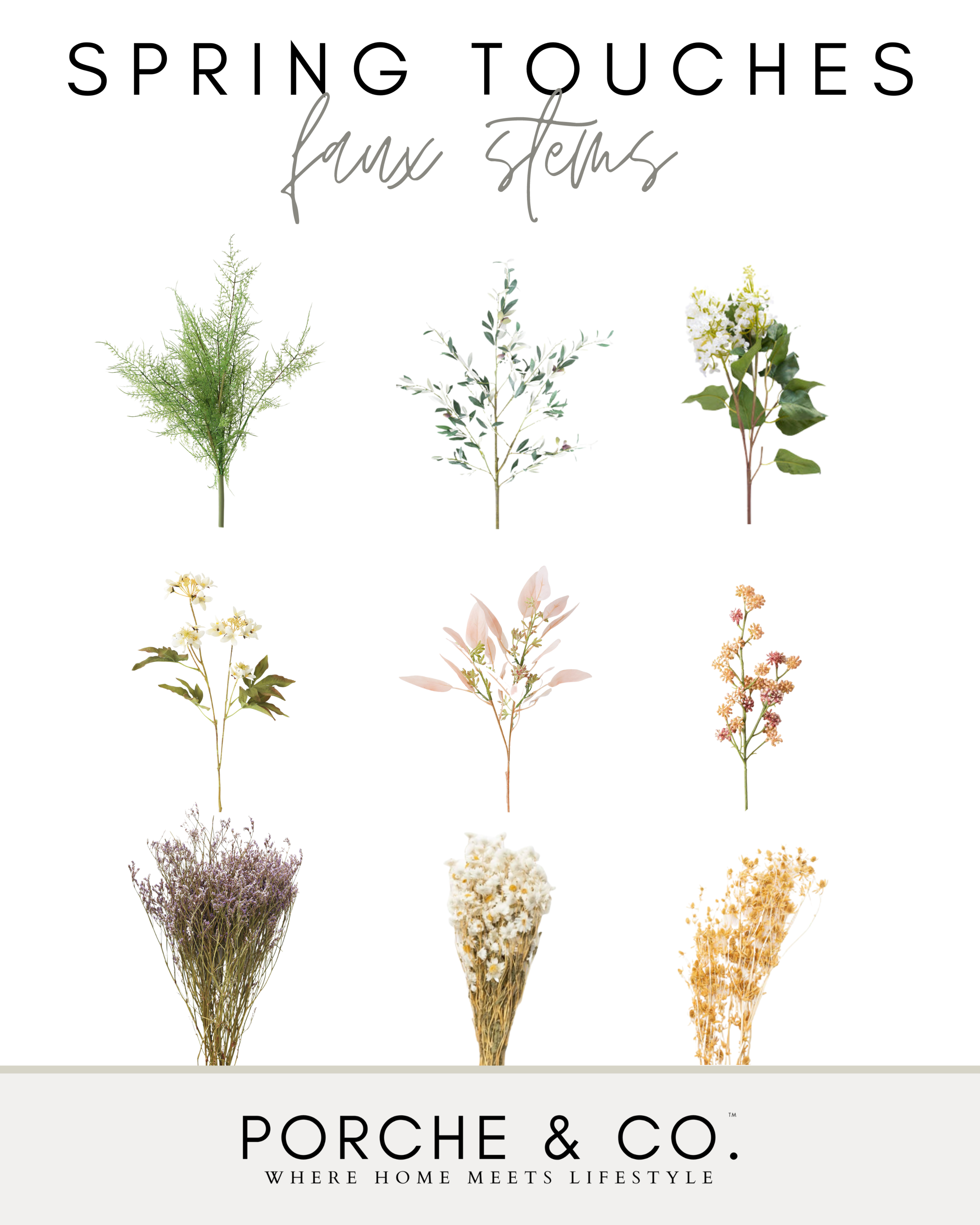 In terms of flowers and greenery inside your home, consider switching out your winter evergreens for seasonal flowers. Our favorites are tulips and daffodils- we love the pop of color they bring into a space! Small bouquets will look lovely on your mantel, coffee table, kitchen counters, or create a larger arrangement of faux stems for a gorgeous and vibrant center piece on your dining room table. Here are some of our favorite faux Spring stems::