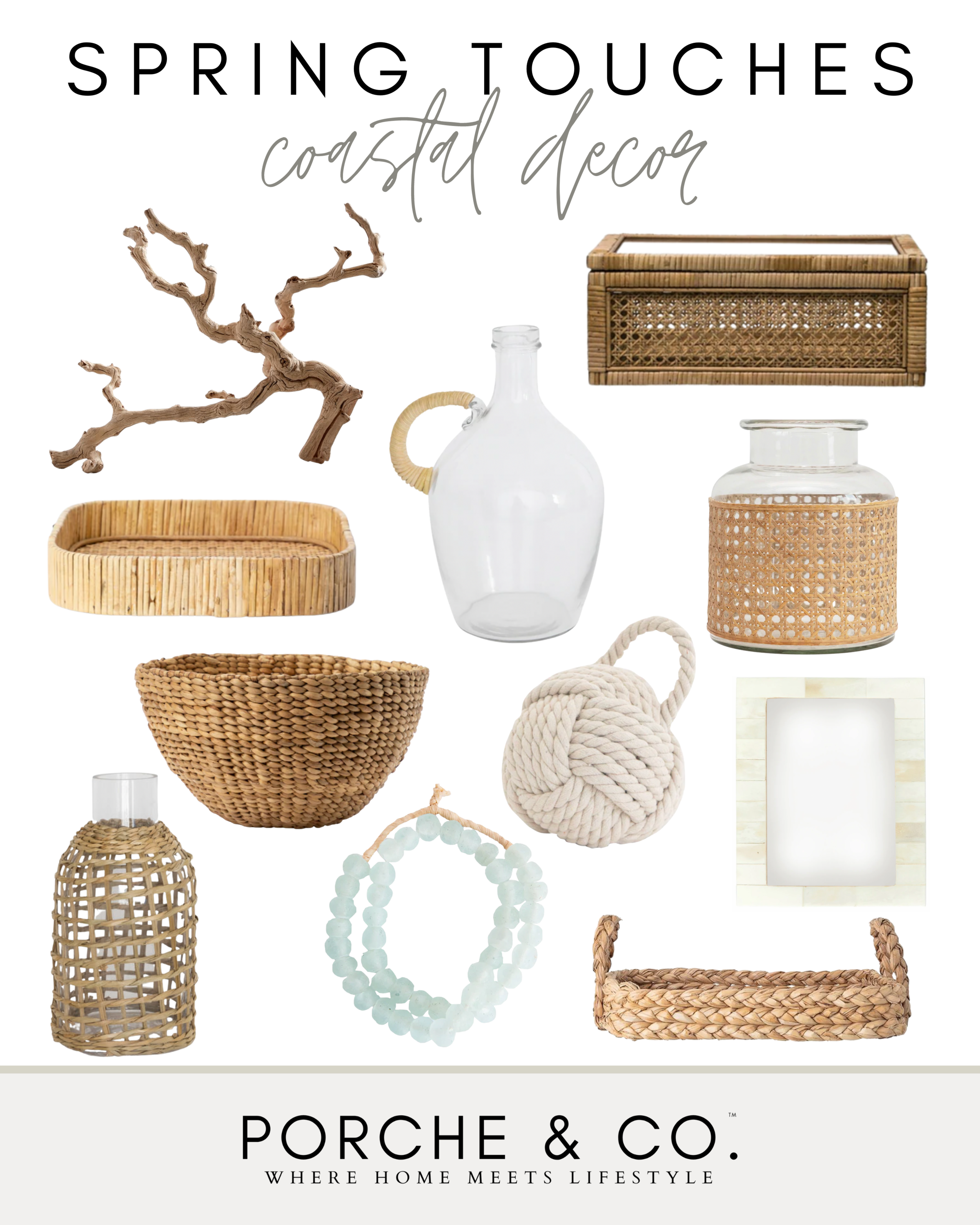 For bathrooms, we love adding touches of color and print with towels, soap dishes or dispensers, and baskets. Woven baskets are great for placing towels, and add a beachy coastal warm feel to any space. Since they also come in an array of sizes, patterns, and colors, you can find one to perfectly fit in any bathroom space. Candles are also a great option for decorating bathrooms and other spaces. Choose tones in lighter shades, and swap out winter scents of balsam and spices for lighter fragrances with floral notes. Here are some of our favorite woven coastal decor items for the Spring::