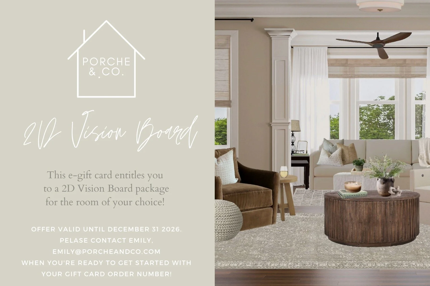 Thinking about giving a gift that truly stands out this year? Consider gifting a room makeover, an e-design experience with Porche & Co. Instead of just a physical present, you can give the gift of a beautifully curated, functional space that brings joy all year long. From selecting finishes and furniture to creating a cohesive space, our online interior design services make it easy to transform any roomβperfect for friends or family who love style but want professional guidance. Check out our packages, to see whatβs right for you and your loved one!
