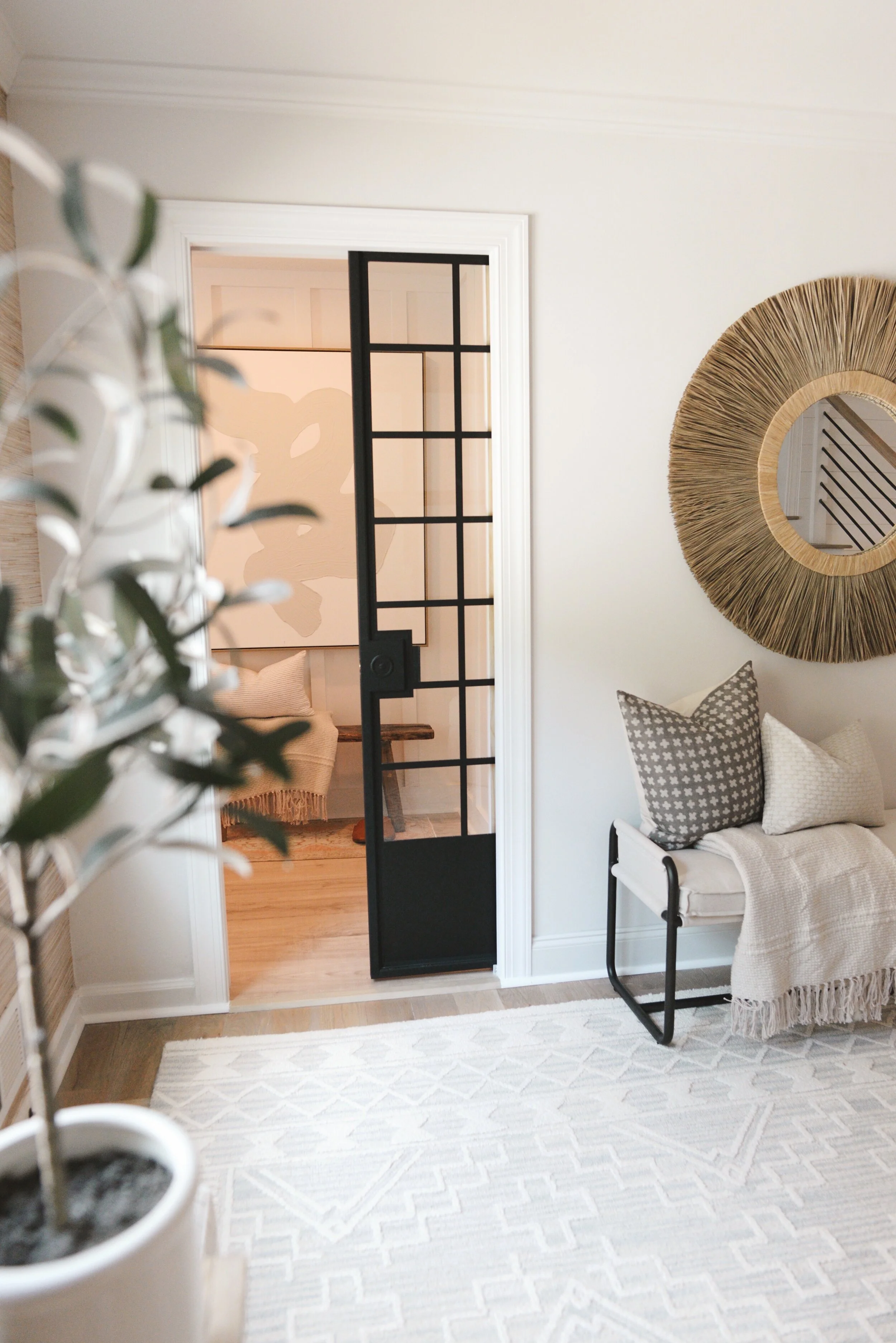 The entryway door to the design studio is one of my very favorite parts of the entire space. previously there was a small 1970s closet door that led to a small closet here when the house was built. when we added the breezeway which connects the additional garage to the main house, we left the original door in this spot. replacing it with this metal and glass pocket door makes such a striking entryway into the design studio and really sets the tone for what is to come. it is modern and timeless all at the same time.