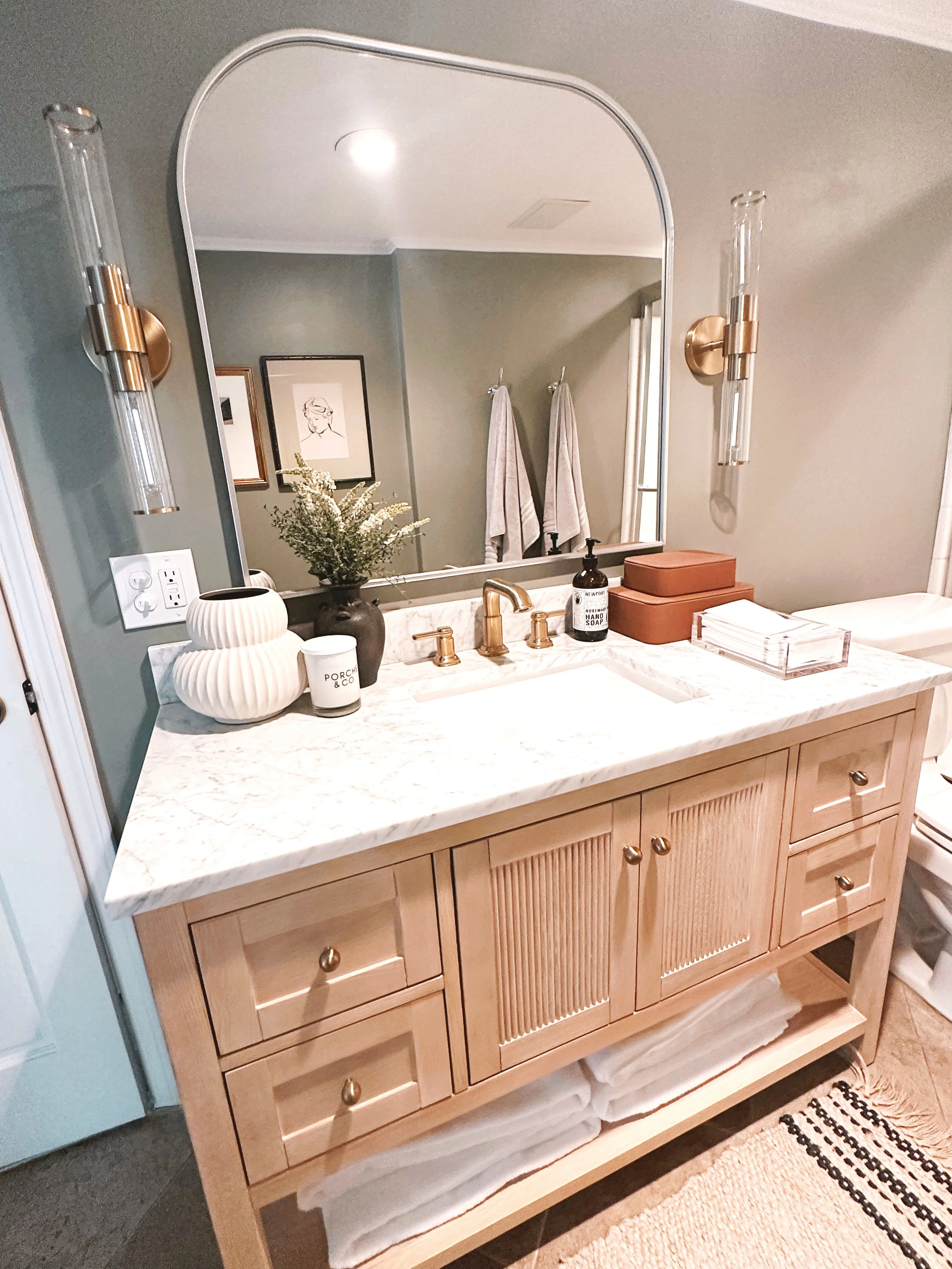 i upgraded my vanity with this gorgeous 49” natural wood fluted vanity that instantly brightens up the space along with its’ stately carrara marble top. It is an amazing price point and comes in three different size options to fit any bathroom space. It also comes with two knob hardware options- brass and chrome. A top the vanity, I chose this beautiful and affordable 8” modern brushed brass faucet. above the vanity i mounted a large 36” wide arch mirror framed by gorgeous brass sconces from the home depot. i love mixing metals so chose to mix brass and chrome throughout this space. The sconces lend a modern touch and are the perfect size to frame the mirror.
