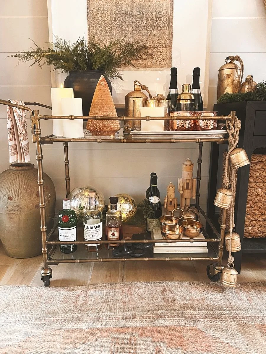 today we are so excited to be sharing a closer look at emily’s bar cart along with along with our favorite bar cart styling tips! emily loves hosting with hers, and it is perfect around the holidays! we are going to share easy ways to style and decorate your bar cart as well as some of our very favorite, affordable bar carts & cocktail accessories! emily also shared her favorite holiday cocktail earlier this week if you’d like to check out the recipe, click here!