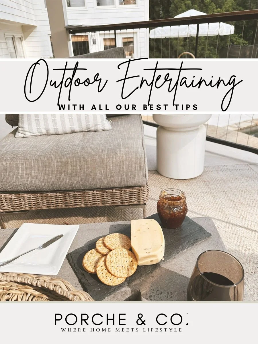 Outdoor lighting is key when entertaining outside. Having string lights, lanterns, and outdoor chandeliers is a great way to keep the gathering going even as the sun starts to set. At Porche & Co. we love the ambiance that outdoor lighting brings to any outdoor space. It brings the cozy feeling from your home to your outdoor living space.
