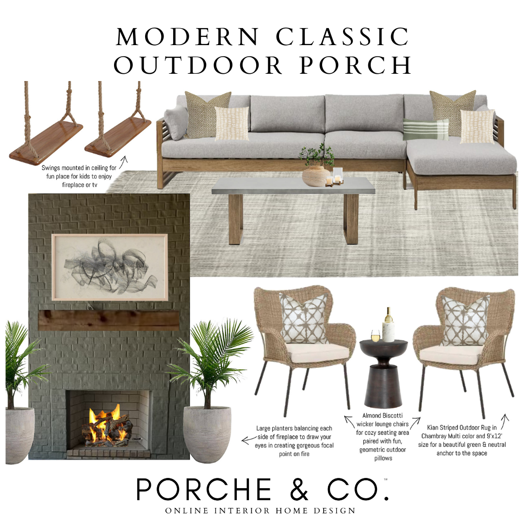 In every design we create, we collaborate with the client to better understand their personal style and vision while also bringing our signature modern classic touch to create a truly timeless and upscale feel to each space. This week we are sharing a few of our modern classic outdoor patio designs! Outdoor spaces are so fun for us to design as we love extending your home into your front and backyard. Porches and patios can extend your home to the outdoors and become functional and inviting spaces that you can enjoy the weather and time spent with your family and friends. We love to use durable, functional pieces that will withstand weather and adding greenery for pops of liveliness and color.