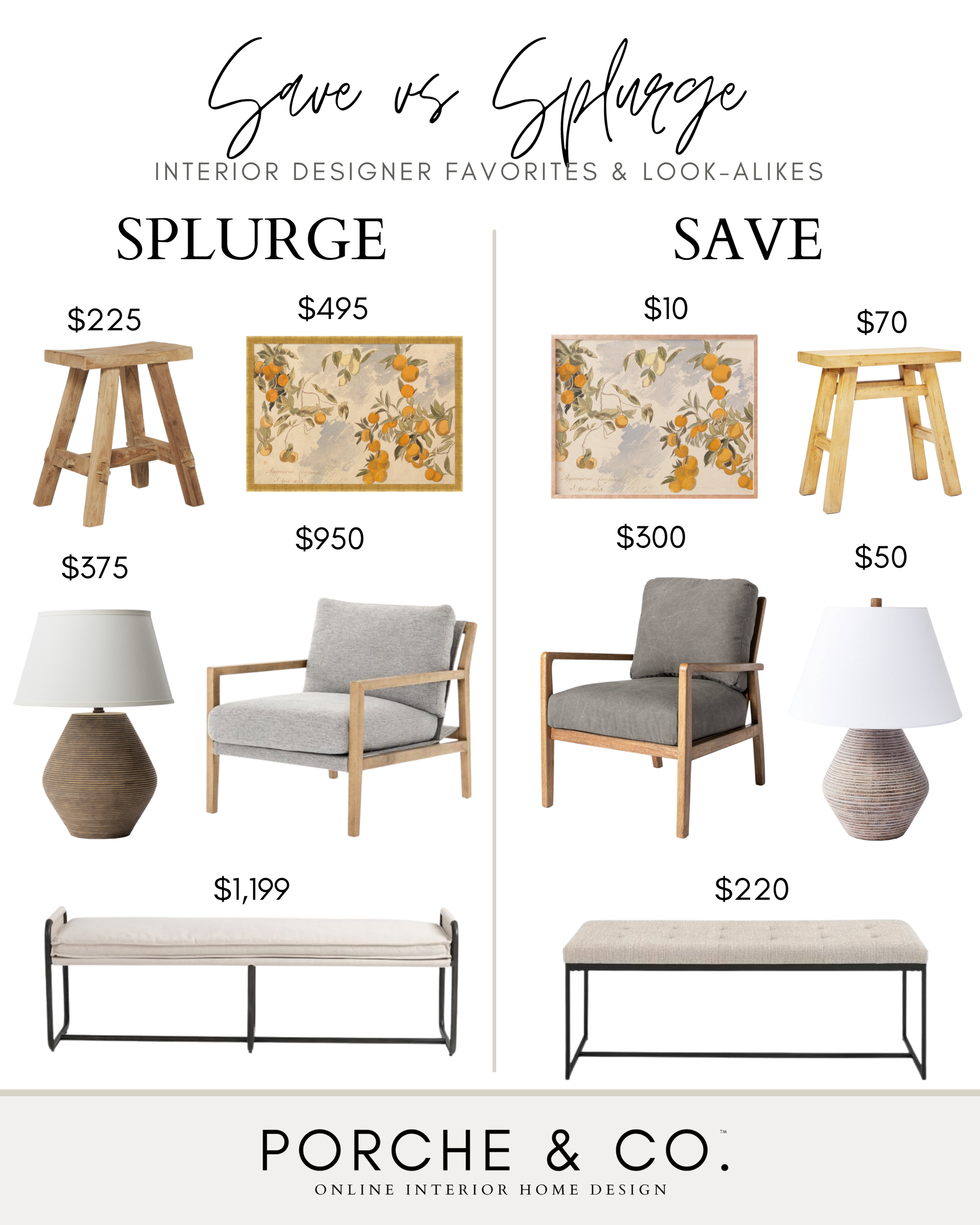 we’ve rounded up some of our favorite save vs. splurge home decor items! we found designer dupes for accent chairs, table lamps, artwork and more! though we do truly believe in the saying “you get what you pay for,” but some items are not always within budget and that’s okay. for larger furniture peices that will get a lot of use (such as couches, beds, chairs, etc.), we often recommend splurging on those items. for smaller accessories like table lamps, accent peices, decor, etc. we like to mix save and splurge items to ACHIEVE a timeless modern classic look. if you’re looking for more designer look-alikes and home decor inspiration, we share our finds daily on liketoknow.it! Be sure you’re following along!