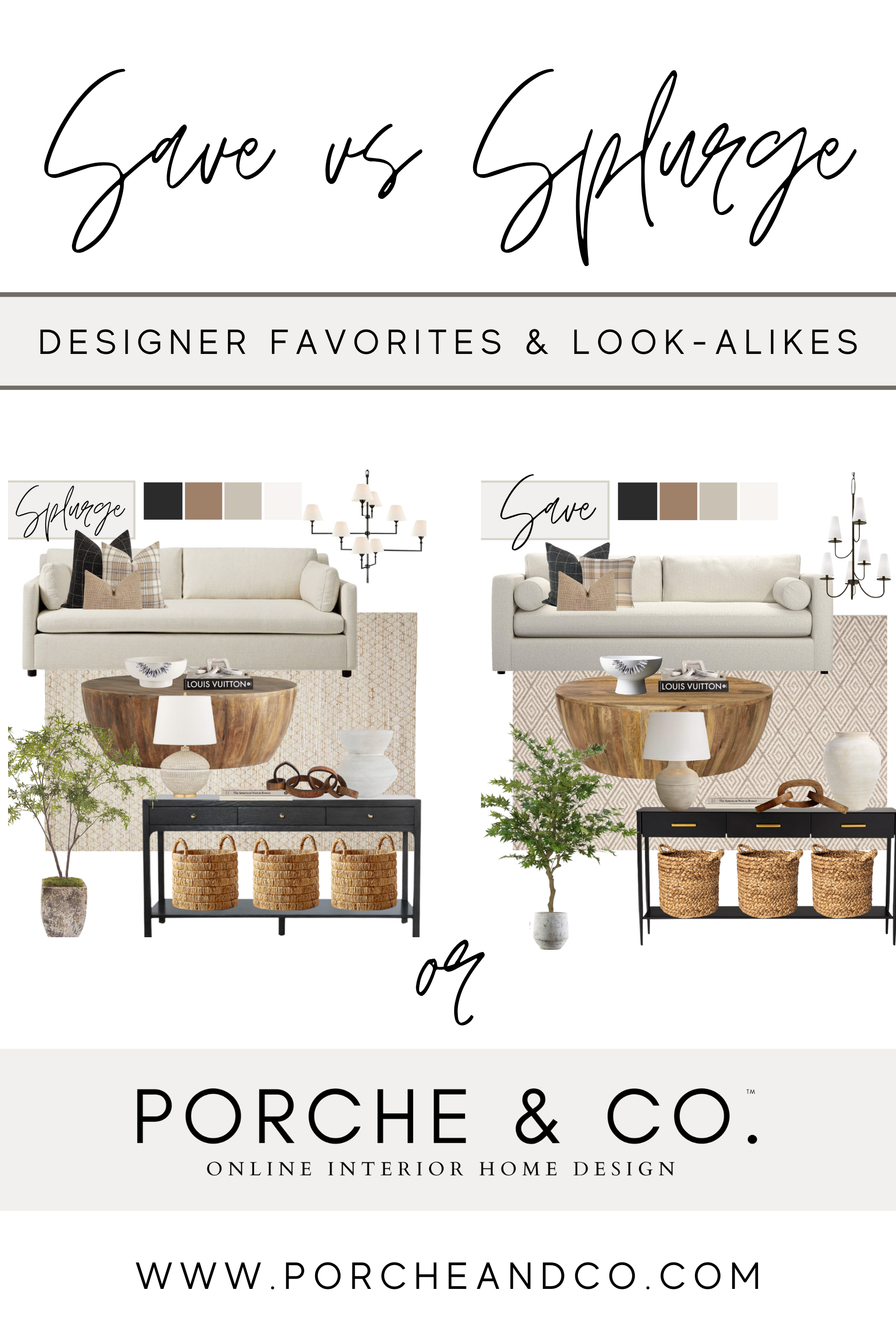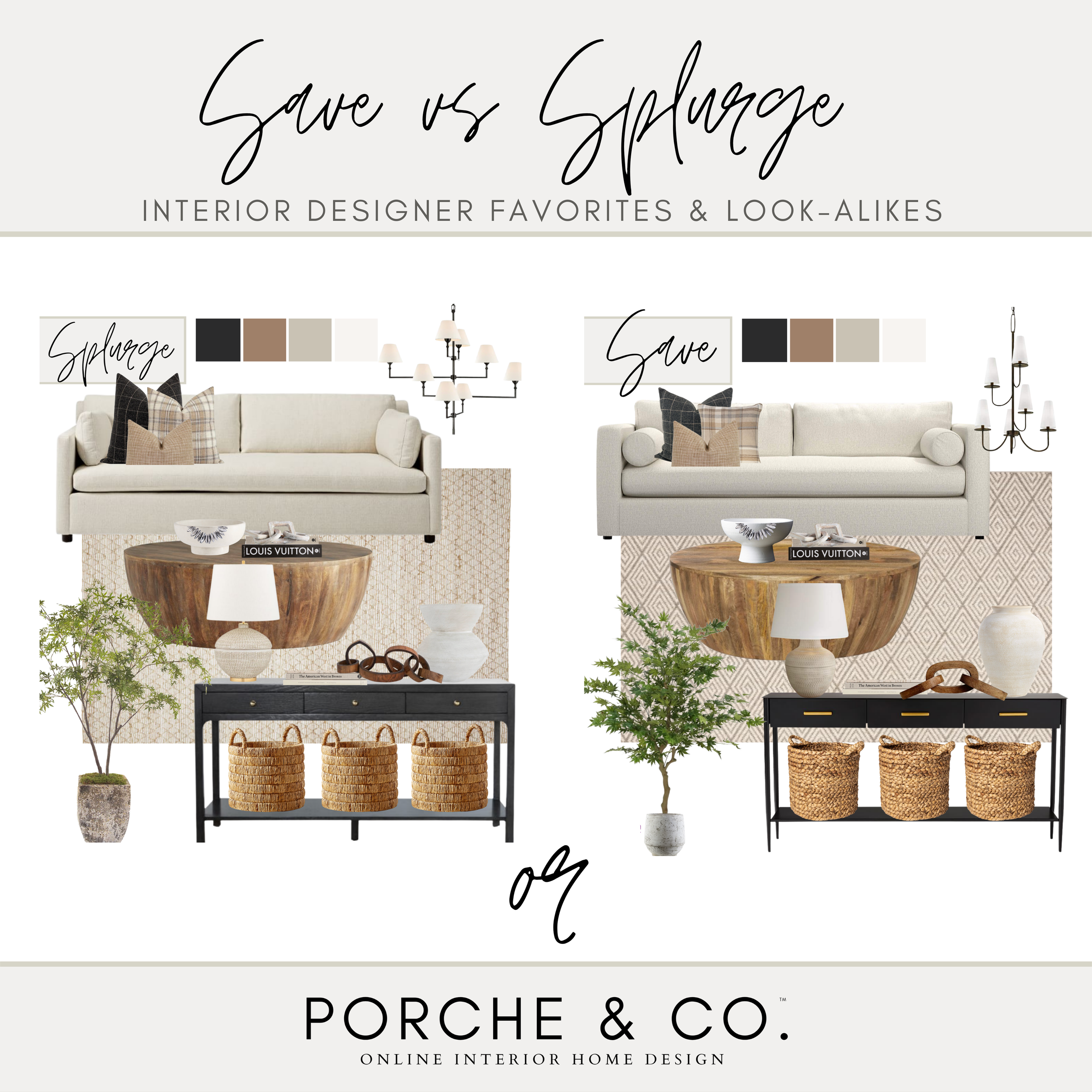 On the SPLURGE design board are some of our favorite Interior Designer finds…and we have found some amazing and affordable look-a-like, dupe options for you on the SAVE design board! Now you get to choose - will you be SAVING or SPLURGING on these amazing finds for your entryway?! we tend to mix both save and splurge finds for the perfect balance within a room. for larger furniture items, we recommend spending the extra money as those peices lend better quality and will hold up over the years. for smaller decor accents, there are some amazing more affordable finds in addition to the splurge finds.