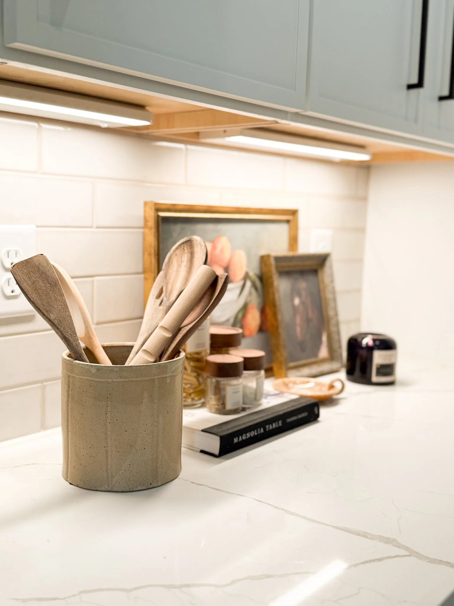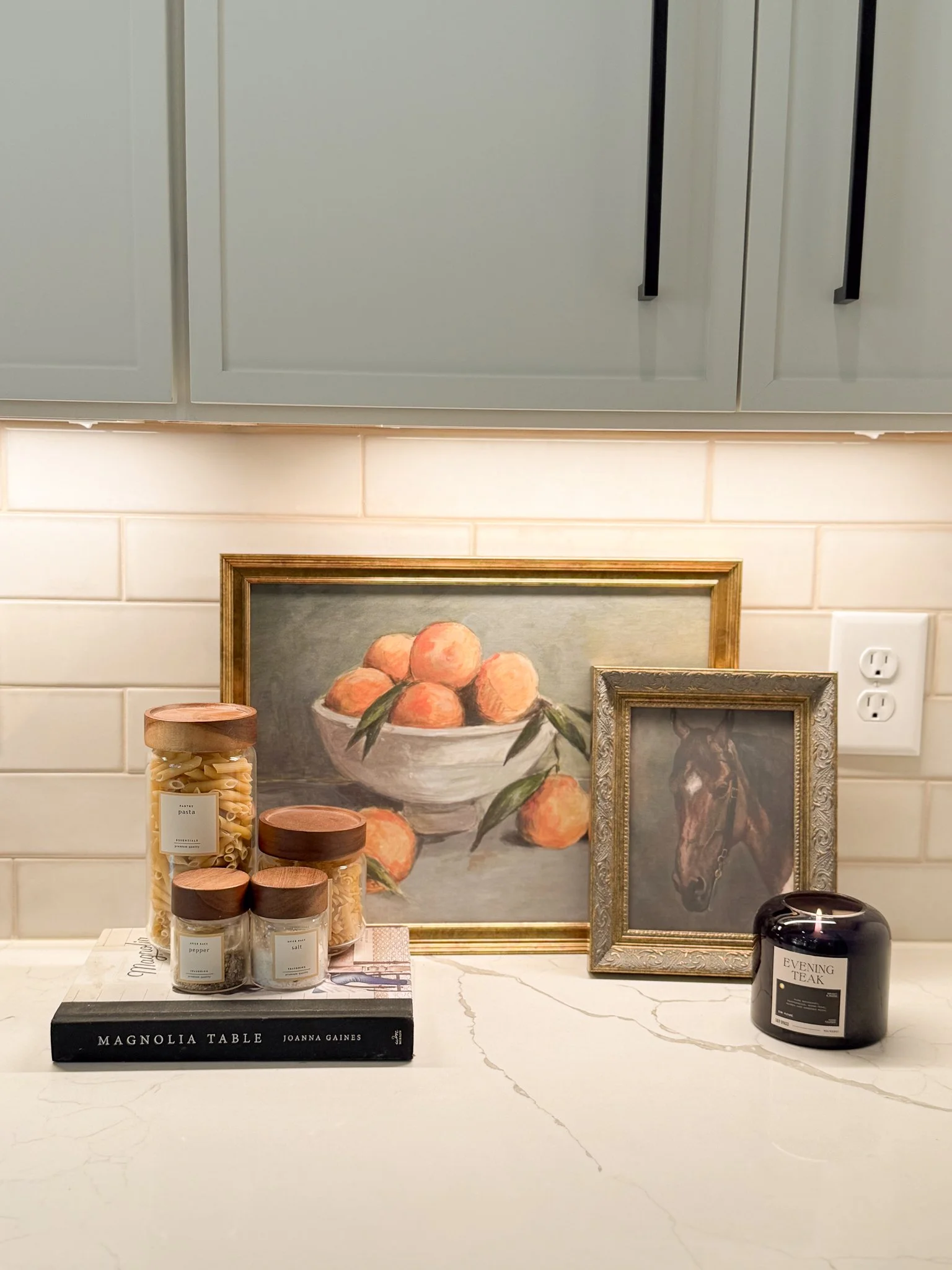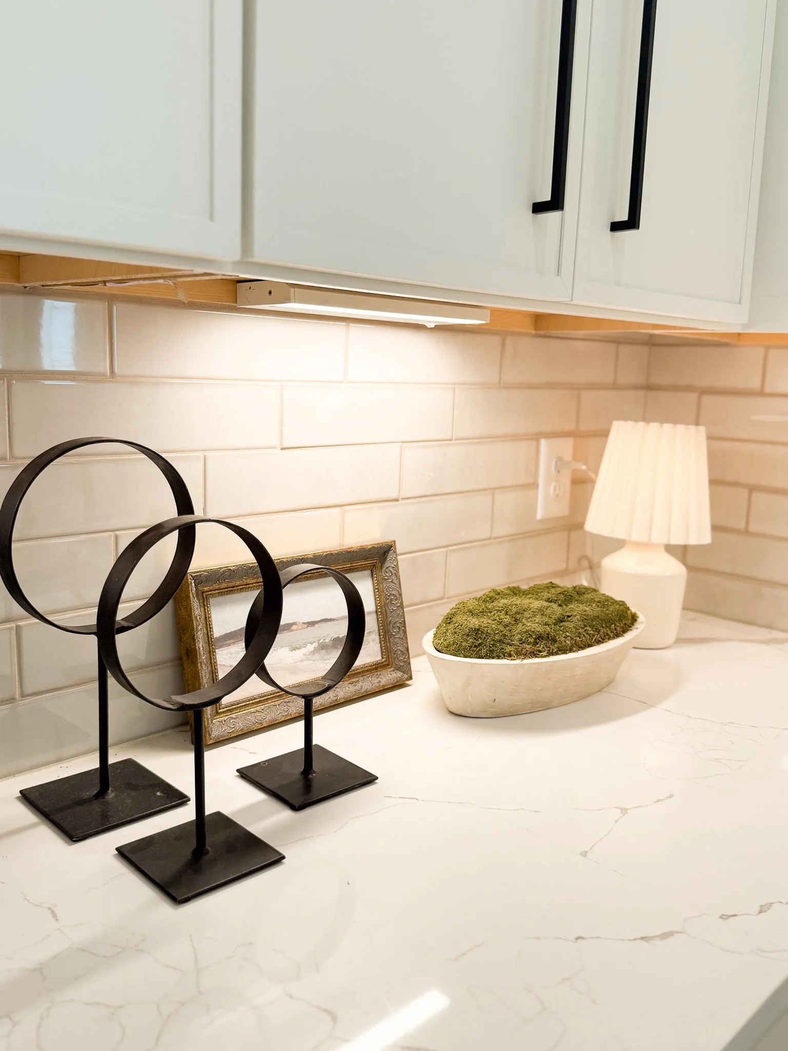 Light it right: If your kitchen has under-cabinet lighting, turn it on in the evening to highlight your styled vignettes and add cozy ambiance.