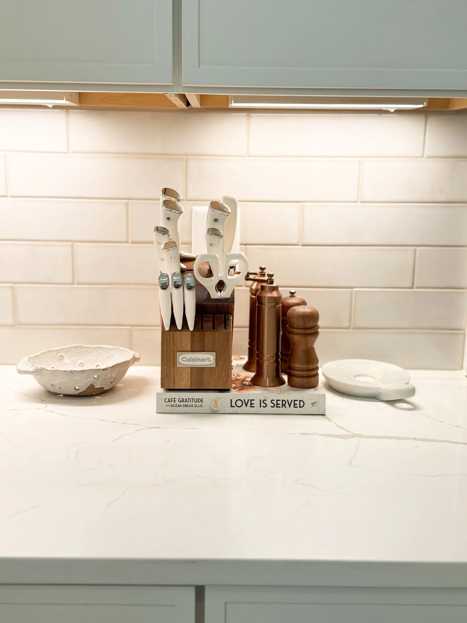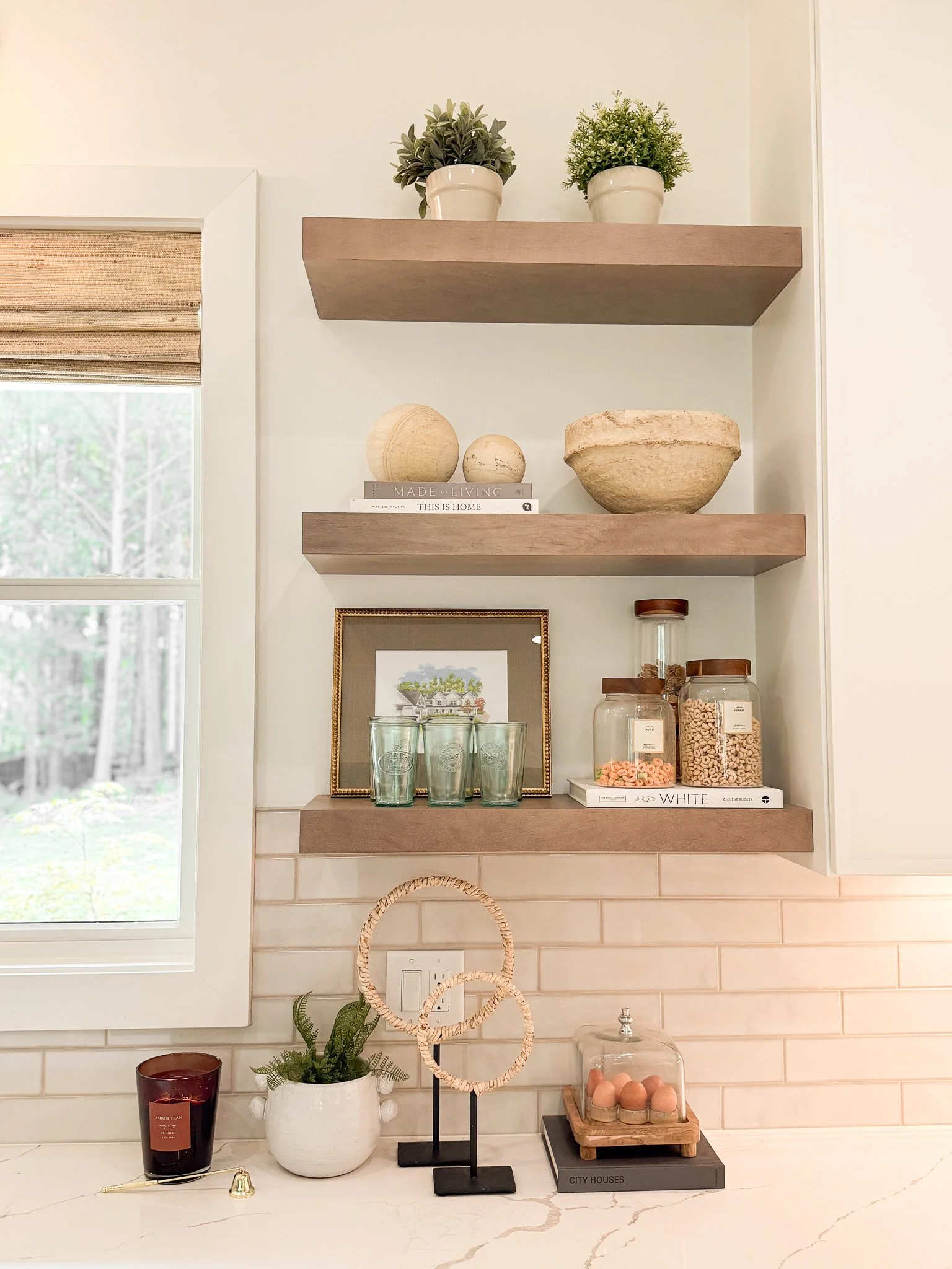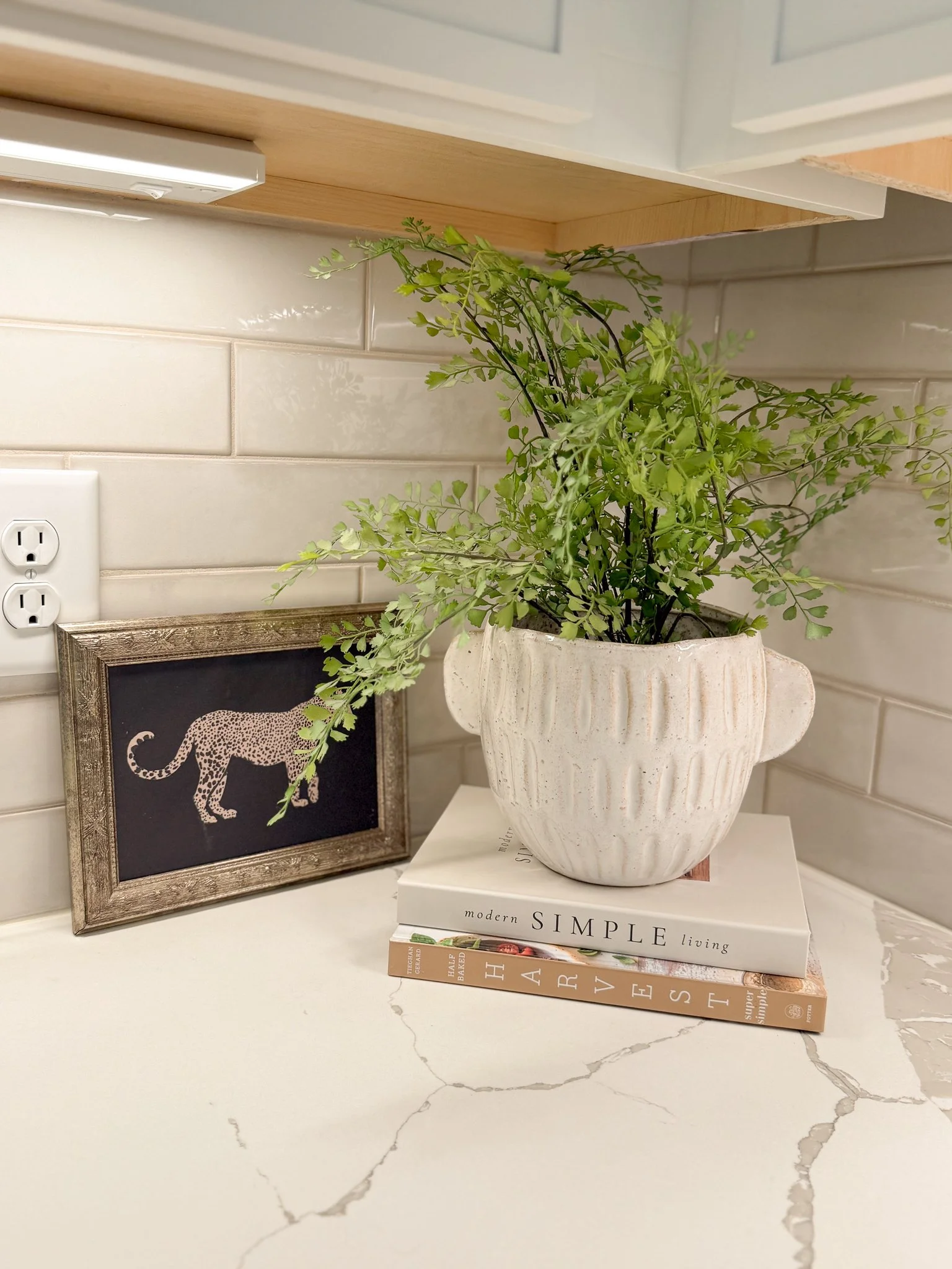 Light it right: If your kitchen has under-cabinet lighting, turn it on in the evening to highlight your styled vignettes and add cozy ambiance.