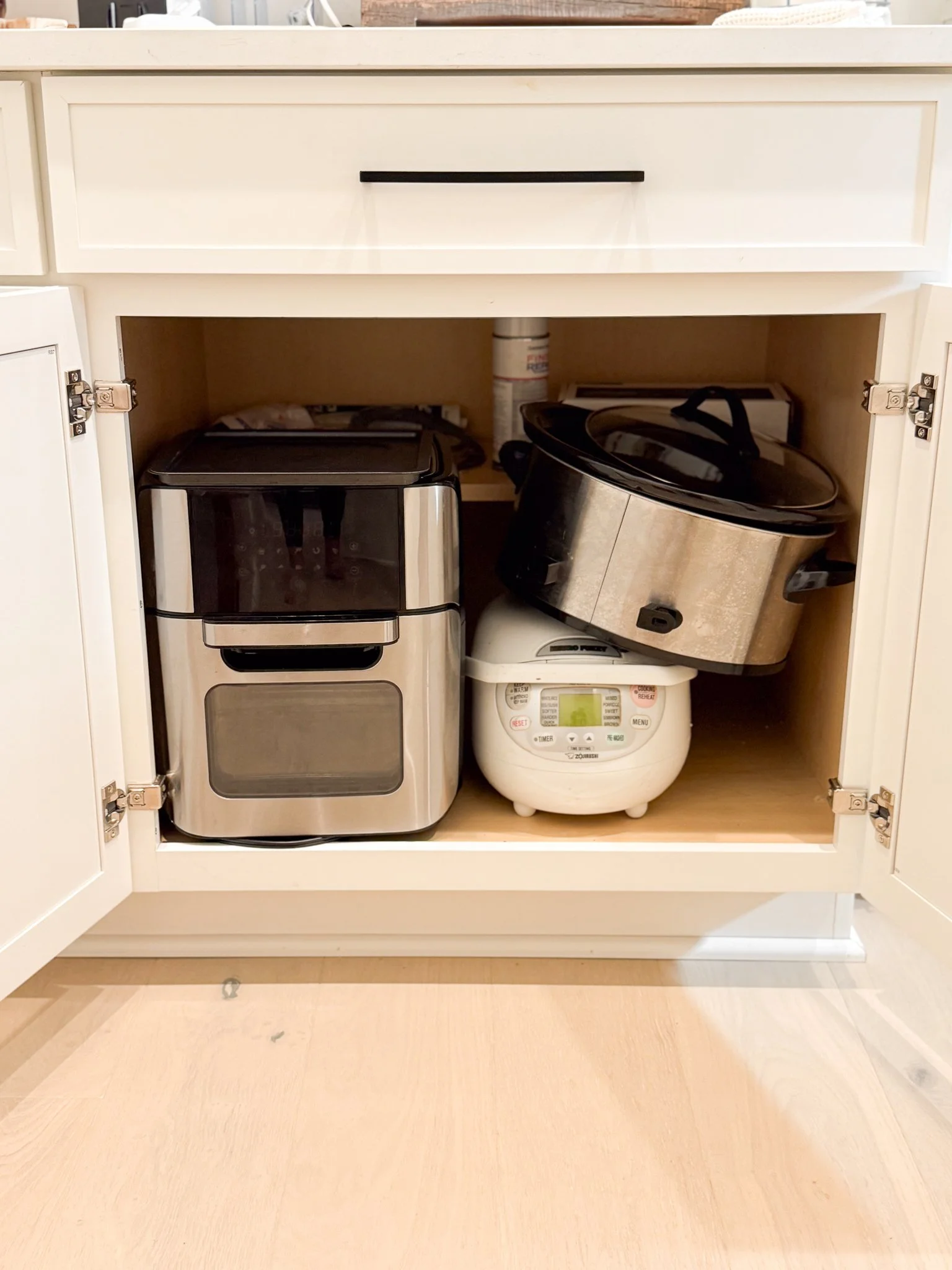 Before you start styling, do a quick sweep of what actually needs to live on your counters day-to-day. Things like the blender, toaster, or random mail can easily be tucked away, while the essentials — coffee maker, knife block, or cooking oils — can stay out if they’re styled intentionally.