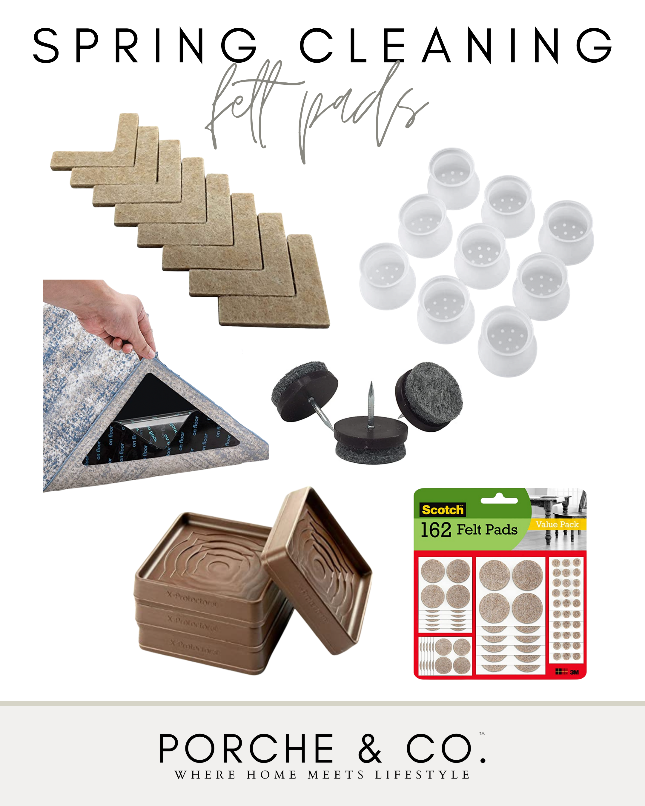 Lastly, something that often gets overlooked are the felt floor protecting pads on the bottom of furniture pieces. Be sure to go through each piece to replace old felt pads with new one. This will help keep your wooden floors looking glossy and new, by helping minimize scratches and marks. Our favorite felt padding options are: